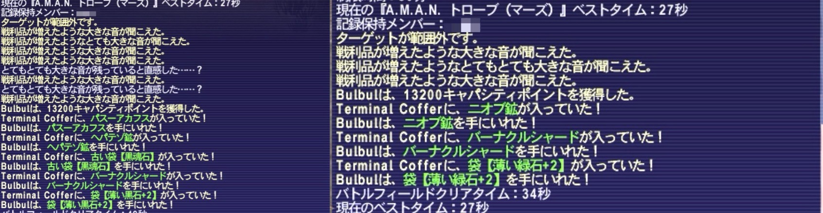 気がつくともう次のバージョンアップが間近に迫ってきていて、相変わらずやろうと思っていたことが処理できてなくてバタバタしつつ、A.M.A.N.トローブに行ってきました。次のキャンペーンにA.M.A.N.トローブの専用装備品出現率アップが来るらしいので、引換券温存した方がいいかなーと思いつつ、マーズ2回。